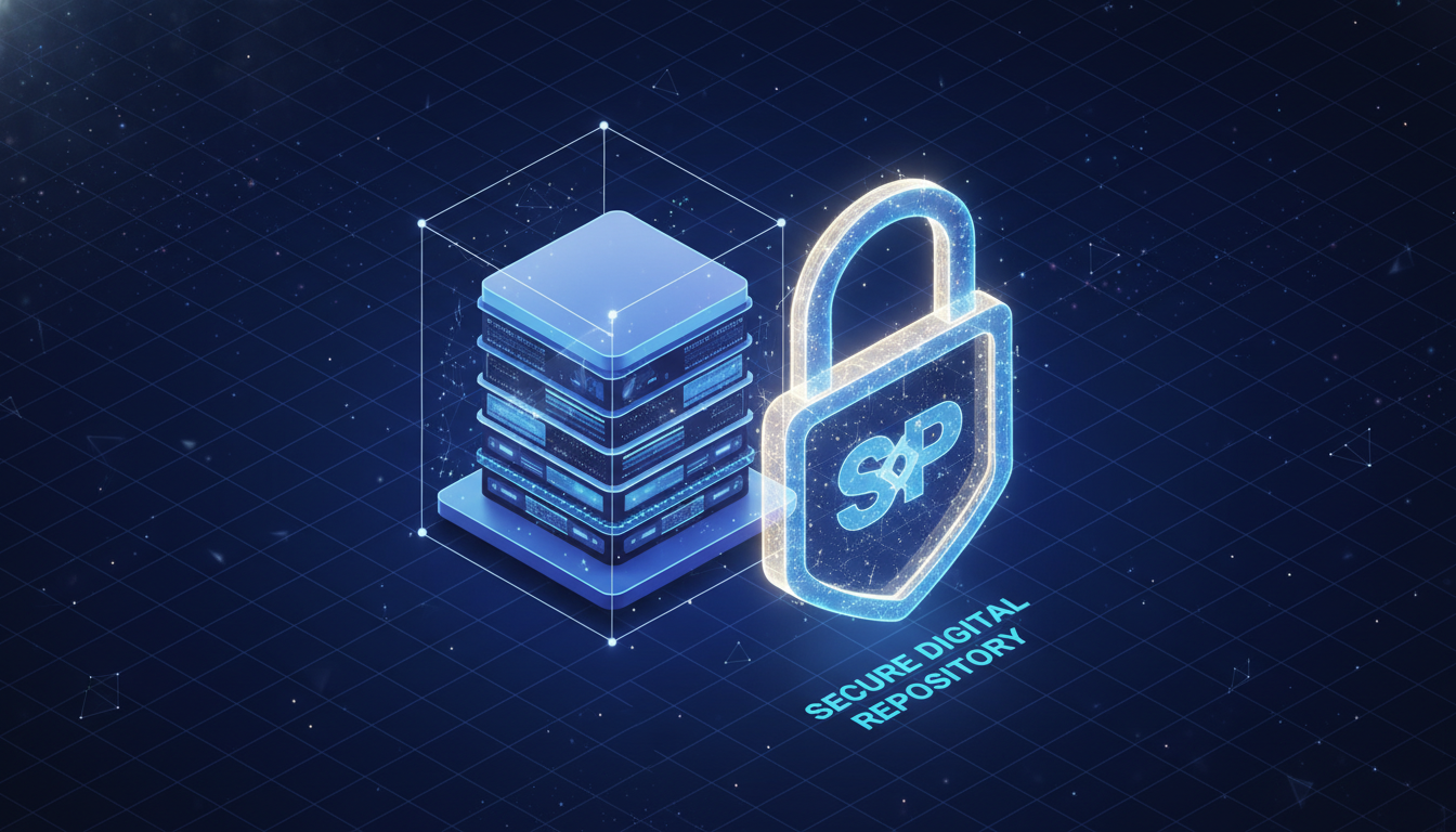 Prompt: A high-tech 3D isometric illustration of a cloud server rack floating in a digital void, with a large glowing padlock shield icon hovering in front of it, symbolizing a secure and private digital repository.